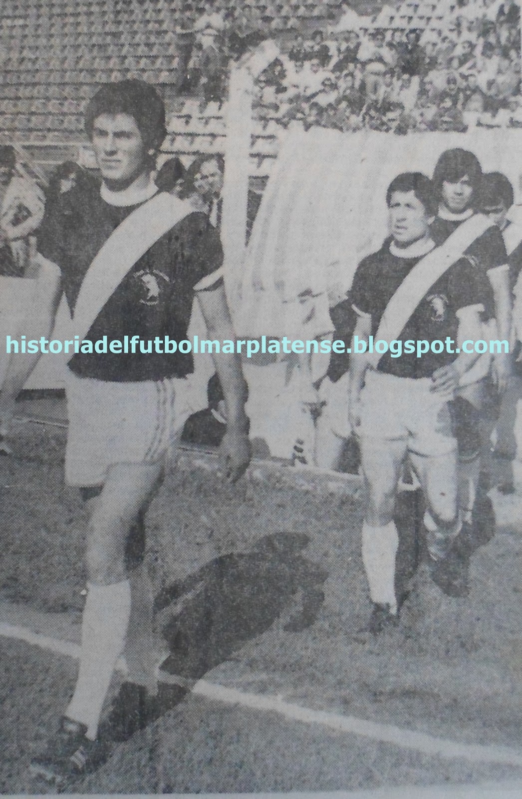 Penúltima fecha del torneo 1977. Alvarado 1 Banfield 0 en el Estadio San Martín. El "Colorado" Romagnoli cubre la pelota ante la marca del "Gallego" Diez. |